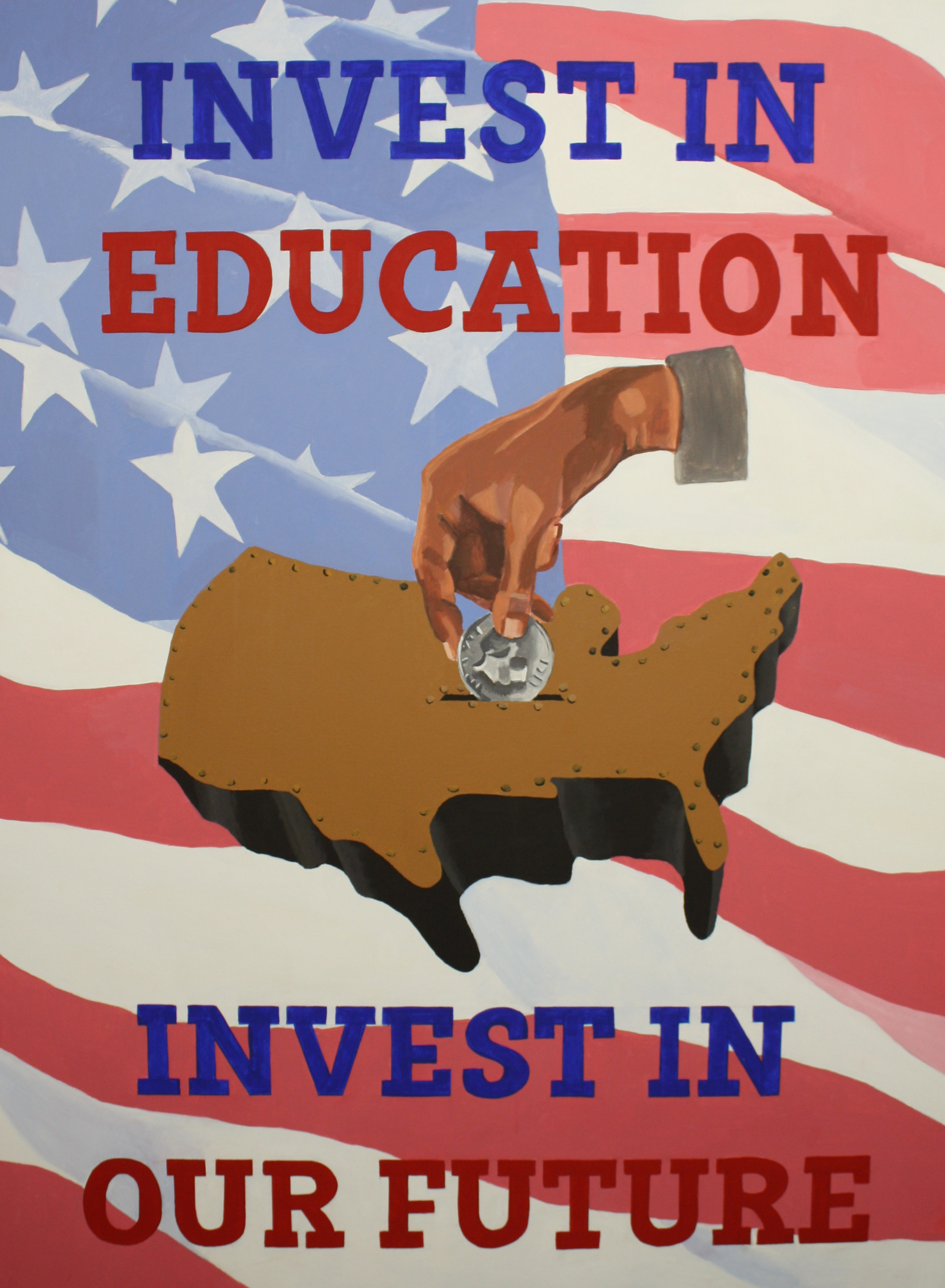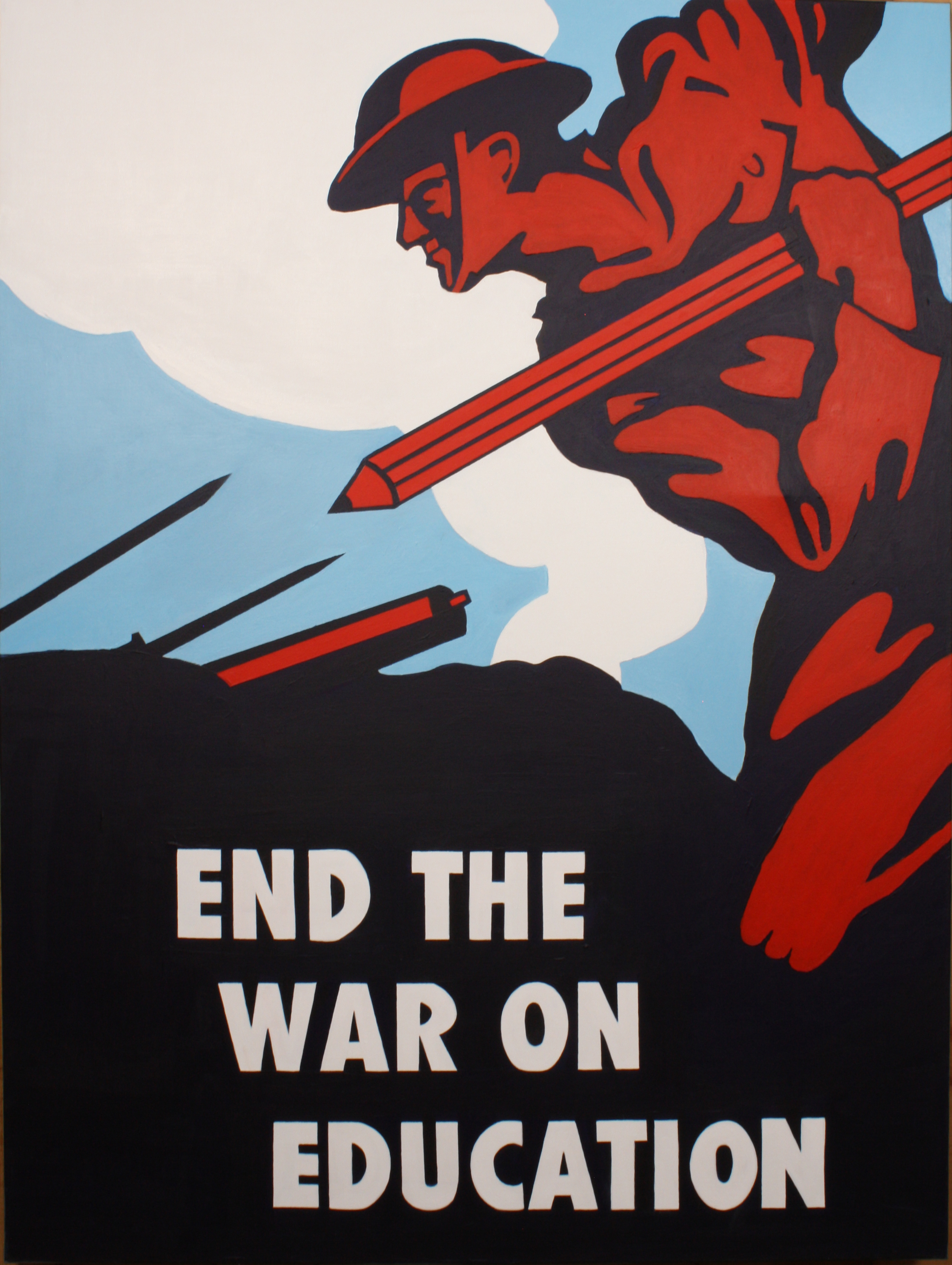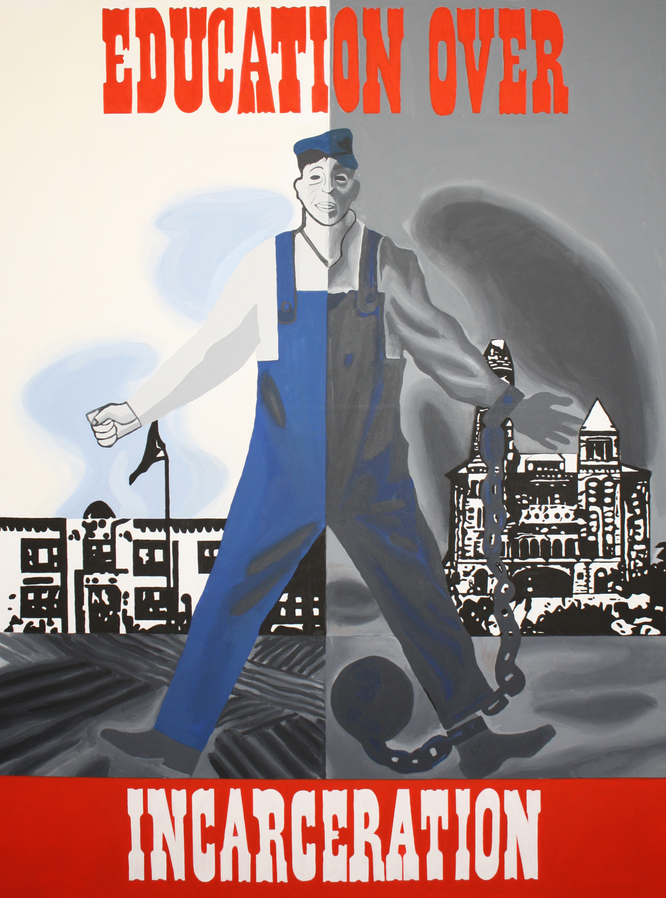 Victory at Home: The Educational Front is a continuation of the concepts in Disruption. The title of the series – an ironic appropriation of the World War II phrase “victory at home”- critiques how educational policy often plays out to a backdrop of culture wars and jingoistic language. While Disruption focused on school disciplinary policy, Victory at Home endorses actions for a more just and equitable educational system, such as disrupting the school to prison pipeline (Fill Schools, Not Prisons and Education Over Incarceration), stopping censorship of books in schools (Come and Take It and Don’t Tread on Me), exposing how the history of redlining impacts present issues in school inequality (The Thin Red Line), and issuing a warning about ideologically based curriculum (Erase History).
